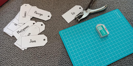 I was contemplating to hand-write the place cards or use a digital printing place so that it was nicer, but I was blessed to find gold-spotted place cards at The Warehouse that matched our goldish theme, so hand-writing it was~